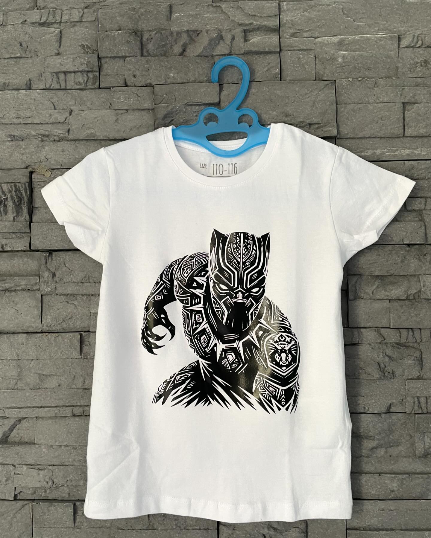T-shirt blanc avec le héro Marvel Black Panther floqué en noir.